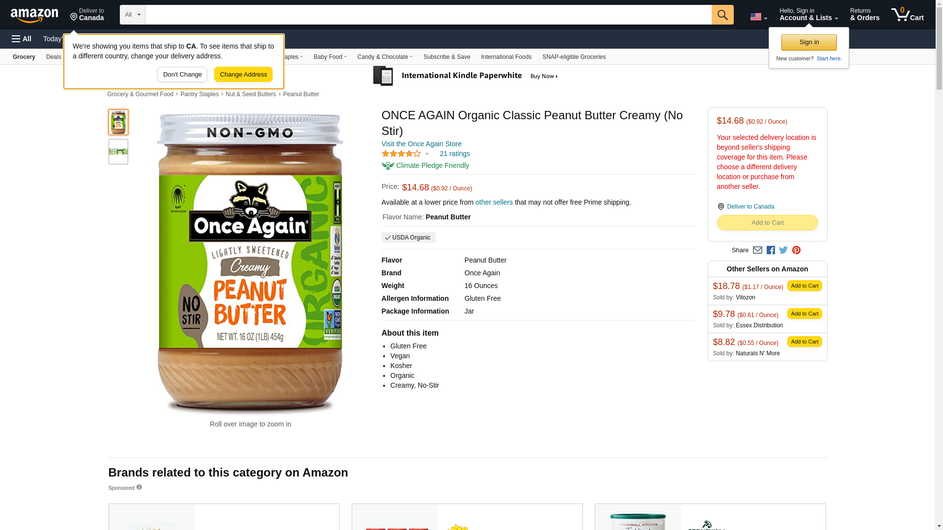 Once Again Organic, Creamy Peanut Butter - No Stir - Lightly Sweetened - 16 oz Jar