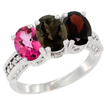 10K White Gold Natural Pink Topaz, Smoky Topaz & Garnet Ring 3-Stone Oval 7x5 mm Diamond Accent, sizes 5 - 10