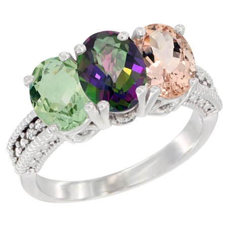 14K White Gold Natural Green Amethyst, Mystic Topaz & Morganite Ring 3-Stone 7x5 mm Oval Diamond Accent, sizes 5 - 10