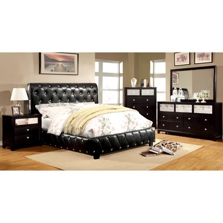 <ul> <li>Collection name: Emmaline</li> <li>Set includes: One (1) platform bed, one (1) nightstand, one (1) dresser, one (1) mirror</li> <li>Materials: Leatherette, metal, solid wood, glass</li> </ul>