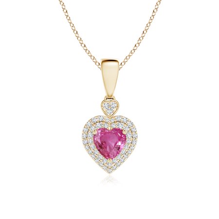 <ul> <li>Diamond Double Halo Pink Sapphire Heart Necklace Pendant in 14K Yellow Gold (6mm Pink Sapphire)</li> <li>Approximate Carat Total Weight 1.27 ct</li> <li>18 inch 14K Yellow Gold Chain Shipped Free With Pendant</li> <li>Pink Sapphires are Heat treated for enhanced brilliance and lustre.</li> <li>Free Certificate of Authenticity and 30-Days Easy Returns.</li> <li>*Get a FREE Gemstone Pendant in Silver w/o Chain</li> </ul>