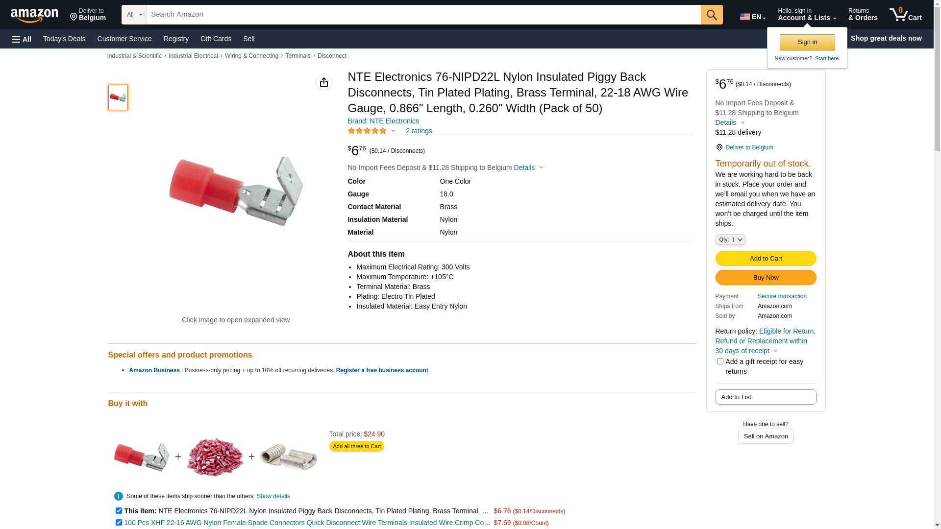 NTE Electronics 76-NIPD22L Nylon Insulated Piggy Back Disconnects, Tin Plated Plating, Brass Terminal, 22-18 AWG Wire Gauge, 0.866" Length, 0.260" Width (Pack of 50)