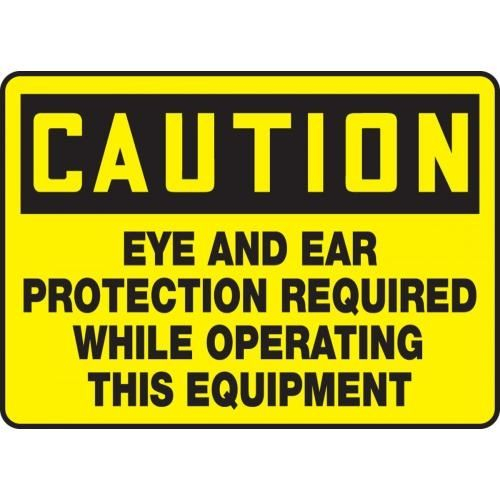 CAUTION EYE AND EAR PROTECTION REQUIRED WHILE OPERATING THIS EQUIPMENT 10" x 14" Dura Fiberglass Sign