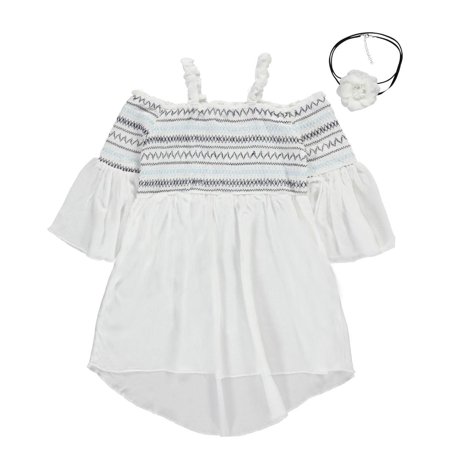 This Beautees top comes with a matching necklace for a cute and complete look! <ul> <li>Beautees top with necklace</li> <li>Silky rayon construction</li> <li>Empire bodice with elastic shirring and contrast stitching</li> <li>Elastic off-the-shoulder neckline with shoulder straps</li> <li>Flounced sleeves with elastic shirring</li> <li>Hi-low hem</li> <li>Choker necklace included</li> <li>100% rayon</li> <li>Machine wash cold, gentle, inside out</li> <li>Imported</li> </ul>