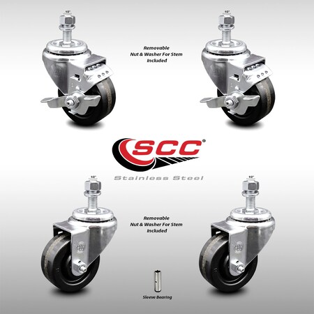 3 Inch SS Phenolic Wheel Swivel ? Inch Threaded Stem Caster Brakes SCC, 2PK