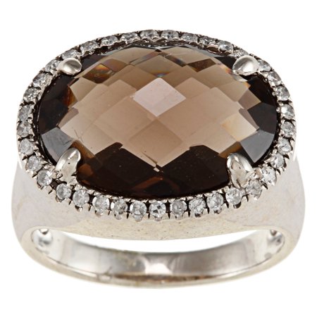 This pretty ring features your choice of an amethyst or smokey quartz center stone encompassed by glittering white diamonds. This ring is crafted of highly polished sterling silver. <br /> <br /> <ul> <li>Gemstone colors: Brown or purple</li> <li>Gemstone shapes: Oval</li> <li>One prong-set oval-cut smokey quartz or amethyst measures 12 mm wide x 16 mm long</li> <li>Total gemstone weight: 9 carats</li> <li>Diamonds: 37</li> <li>Diamond cut: Round</li> <li>Diamond weight: 1/5 carat</li> <li>Color: J-K</li> <li>Clarity: I2-I3</li> <li>Setting: Prong</li> <li>Metal: Sterling silver</li> <li>Finish: High polish</li> <li>Metal weight: 5.11 grams</li> <li>Ring setting dimensions: 14 mm wide x 18 mm long</li> <li>Band dimensions: 3 mm wide</li> <li>This ring is available in <b>size 6.5 only</b></li> </ul> <br /> <b>Diamond total weight: 1/5* carat TW</b> <br /> <br /> <b><i>All carat weights and measurements are approximate and may vary slightly from the listed dimensions. *T.W. (total weight) is approximate. 1/5 carat T.W. may be 0.17 to 0.23 carat. Treatment code N (diamond) and E (quartz, amethyst). See <a href="http://www.overstock.com/2200/static.html" target="_blank"><span class="links">Treatment Guide</span></a> for further information.</i></b> <br /> <br /> <a href="http://www.overstock.com/downloads/pdf/2010_RingSizing.pdf"><span class="links">Click here for ring sizing guide</span></a> <br /> <br /> <i>This ring <b>cannot</b> be resized.</i> <br />