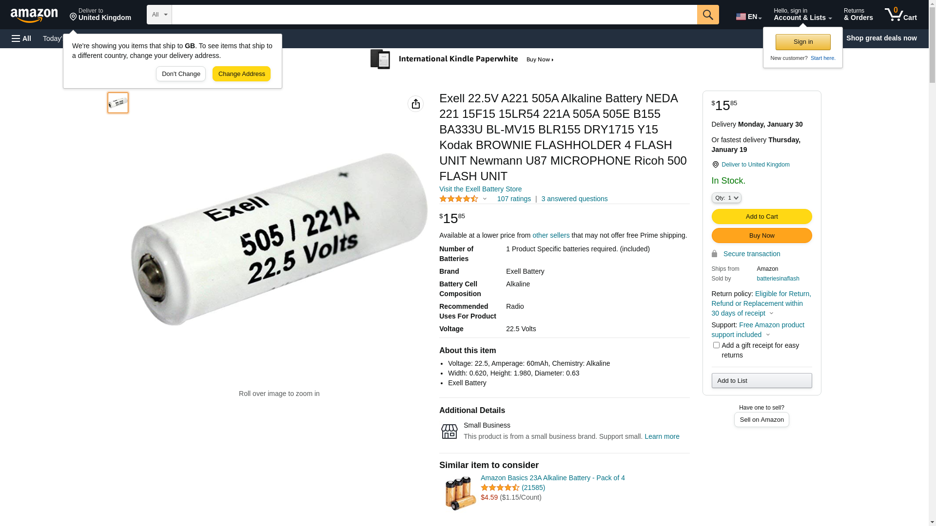 Exell 505A/A221 22.5V 60mAh NEDA 221 Alkaline Battery Fits Replaces Bolsen Flash Unit, Ricoh 500 Flash Unit, Kodak Brownie Flashholder 4, 15F15, 15LR54, 221, 221A, 333/U, 505, 505A, 505E/B, 75, A221