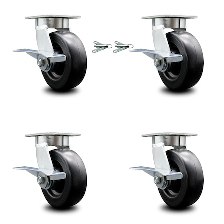 Kingpinless Polyolefin Swivel Top Plate Caster Set 4 w/6" x 2" Black Wheels-Includes 2 Swivel with Brakes and Bolt on Swivel Locks&2 Swivel with Brakes-2800 lbs Total Cpty-Service Caster Brand