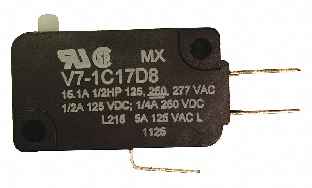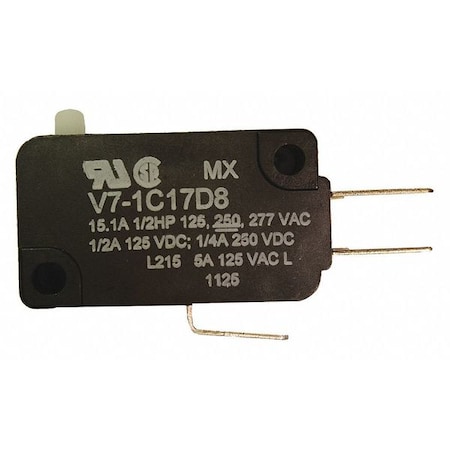 Honeywell Snap Action Switch V7-1C17D8, SPDT circuitry, pin plunger actuator, quick connect termination, 15.10 A, 277 Vac.
