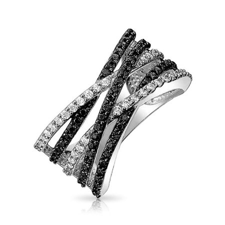 Rhodium Plated Criss Cross Black and Clear CZ Ring
