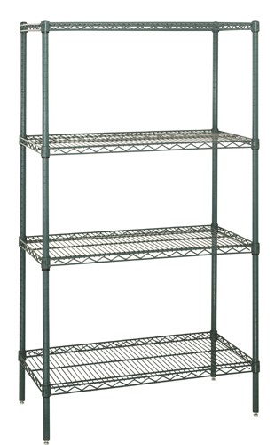 This Proform wire shelving starter unit has a green epoxy coated finish that is electrostatically applied to carbon steel that has been treated with an iron phosphate. This wire shelving style is ideally suited for wet or moist environments as the shelving finish contains an antimicrobial agent that will not allow the build up of bacteria. This NSF approved shelving system has a 15 year warranty against rust or corrosion.