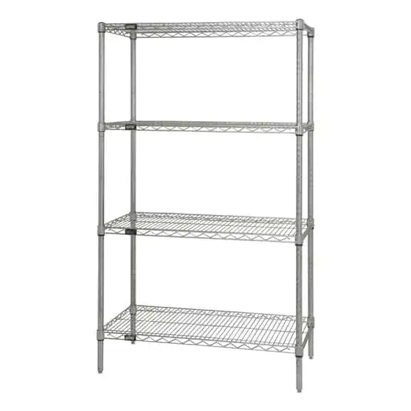Quantum brand modular wire systems shelving units are designed in various styles and designs and are NSF approved. These Quantum Food Service shelves are made to withstand daily industrial and commercial use. Most rack units are designed with adjustable shelves so you can position every shelf with the optimal space required. You'll find Quantum Storage shelves at restaurants, warehouses, storage spaces, stores, garage racks, or even in home kitchens. Just combine the shelf with post sizes in many finishes to compliment your space. Fast easy assembly in minutes. Just connect the split sleeve with our grooved numbered posts and you are ready to stack the racks. All welded shelf construction is combined with architectural wire trusses to provide incredible solid 800 lb support per shelf. Our starter kits come with 4 posts and 4 shelves. Wire allows air to circulate for minimal dirt accumulation. All units come with our 1 Year warranty against defects.