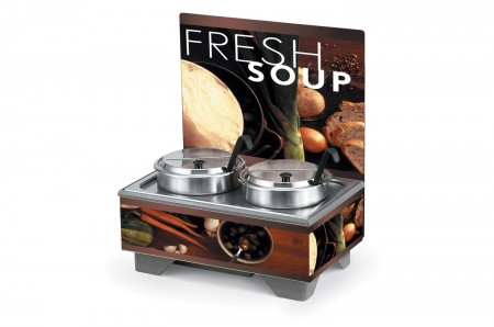 Vollrath's Cayenne? 72020 Full Size Rethermalizing Model 1220 Soup Merchandiser Base, flush mount menu board, Tuscan graphics, & 7 quart accessory pack: (1) 19192 7 quart, adapter plate, (2) 78184 7 quart, insets, (2) 47488 hinged covers, (2) 4980320 3 oz., Kool-Touch? stainless ladles, 18-1/2"W x 26-1/4"D x 13-3/4"H, 120v/60/1-ph, 1000 watts, 8.3 amps, NEMA 5-15P, UL, NSF, Made in USA