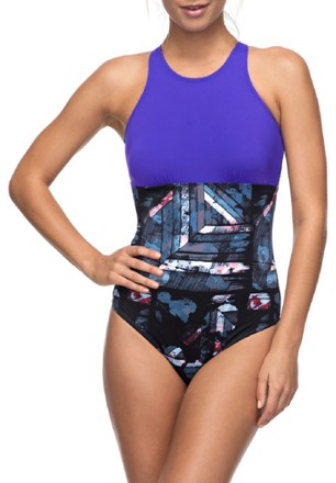 One-piece swimsuit for women. Features include: mix of color-block design, print & heather fabric, mesh insert at back, medium coverage, removable padding, chlorine resistant and recycled fabric.