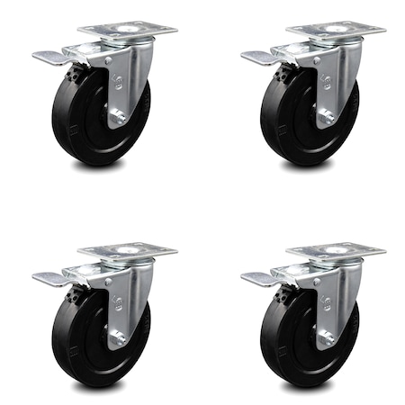Soft Rubber Swivel Top Plate Caster Set of 4 with 5 Inch Black Wheels - Includes 4 Swivel with Total Lock Brakes - 1100 lbs. Total Capacity - Service Caster Brand