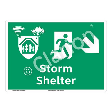<p><strong>Word Message: </strong><br />Storm Shelter </p><p><strong>Description: </strong><br />Clarion Safety Systems brings you high quality storm shelter safety signs (ITEM# F1301-) which are produced on premium plastic material and are expertly designed to meet your safe-area sign needs. </p><p><strong>Material Information:</strong></p> <ul> <li><strong>Material</strong>: (S2) Outdoor Weather Tuff Plastic</li> <li><strong>Base Materials</strong>: .060" Rigid White Plastic</li> <li><strong>Overlaminate</strong>: 3M .003 Ultra-Clear Weather Tuff UV resistant</li> <li><strong>Mounting Option</strong>: Mounting holes</li> <li><strong>Application</strong>: Indoor/Outdoor</li> <li><strong>MaxTemp</strong> (F): 140</li> <li><strong>MinTemp</strong> (F): 32</li> <li><strong>Chemical Resistance</strong>: Excellent</li> <li><strong>UV Resistance</strong>: Excellent</li> <li><strong>Outdoor durability</strong>: Excellent</li> <li><strong>Storage Stability</strong>: Stable. Optimum storage conditions: 72 F @ 50% relative humidity</li> <li><strong>Expected Life Indoor</strong>: Long term</li> <li><strong>Expected Life Outdoor</strong>: 5 - 10 years (expected outdoor life may vary due to climatic conditions)</li> <li><strong>RoHS</strong>: No</li> <li><strong>CRoHS</strong>: No</li> <li><strong>REACH</strong>: No</li> </ul>