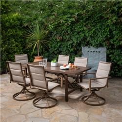 Fairhope 7-Piece Outdoor Dining Set with 6 Padded Contoured-Sling Swivel Rockers and a 74-In. x 40-In. Trestle Table, Tan - Hanover FAIRDN7PCSW6-TAN