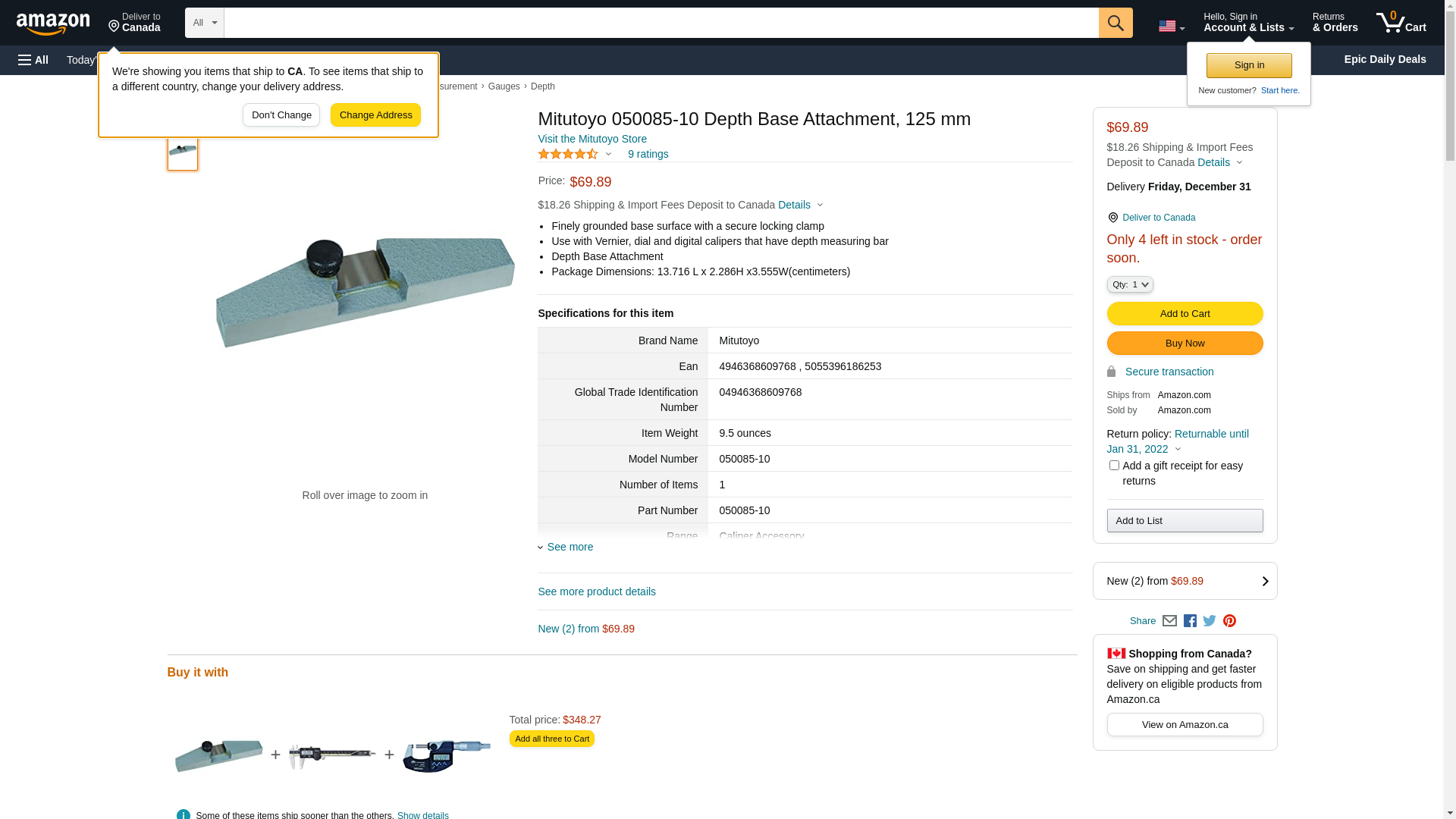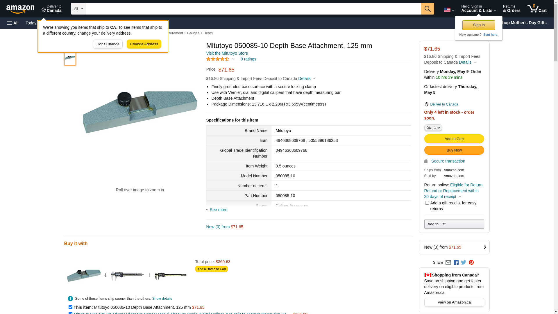 Mitutoyo 050085-10 Depth Base Attachment, 125 mm