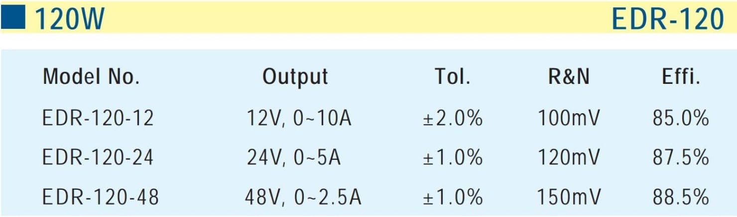 | Feature | Brand:MEAN WELL<br> Model:EDR-120-12<br>Output:120W12V10A<br> |