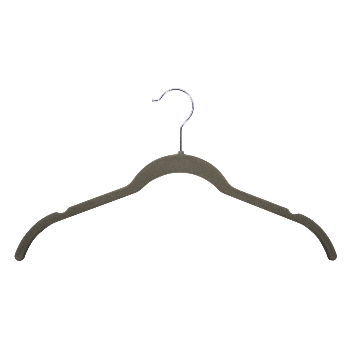 Save space with these ultra-thin 3/16" thick top hangers. Constructed of plastic with a metal hook. The grey top hangers feature a flocked velvet finish to prevent garments from sliding. Notches will help secure straps in place. These 17 3/8" wide top hangers will hold most adult sizes. Sold in cases of 50. The slim profile of the top hangers makes them perfect for use with lingerie, swimsuits, sleepwear and other lightweight apparel.