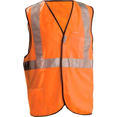 Breakaway High Visibility Vest, ANSI Class 2, Vest Size XL, Traffic Safety Vest Color Orange/Red, Fits Chest Size 44 In. to 46 In., Gender Unisex, Stripe Color Silver, Vest Material Modacrylic, Vest Closure Type Hook-and-Loop, ATPV Rating Not Rated, Hazard Risk Category (HRC) 0, Vest Stripe Color Family Silver, Back Stripe Pattern U-Block, Vest Length 29 in, Number of Pockets (Inside) 1, Number of Pockets (Outside) 2, Number of Pockets with Closure 0