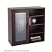 - 5/8" thick compressed wood cabinetry with a durable laminated finish. Three shelves behind a hinged door with translucent plastic insert; four open shelves.