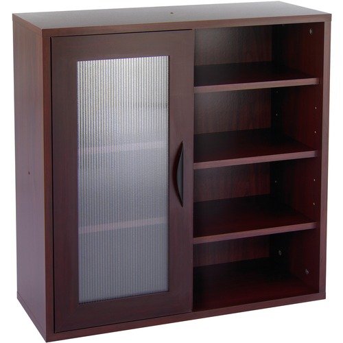 | Feature | Endless solutions for office organization. 5/8" thick compressed wood cabinetry with a durable laminated finish. Three shelves behind a hinged door with translucent plastic insert; four open shelves. Contemporary black elliptical door pull. Fully finished back. May be stacked two high to create a custom storage arrangement. Shelf count incluldes bottom of cabinet. |