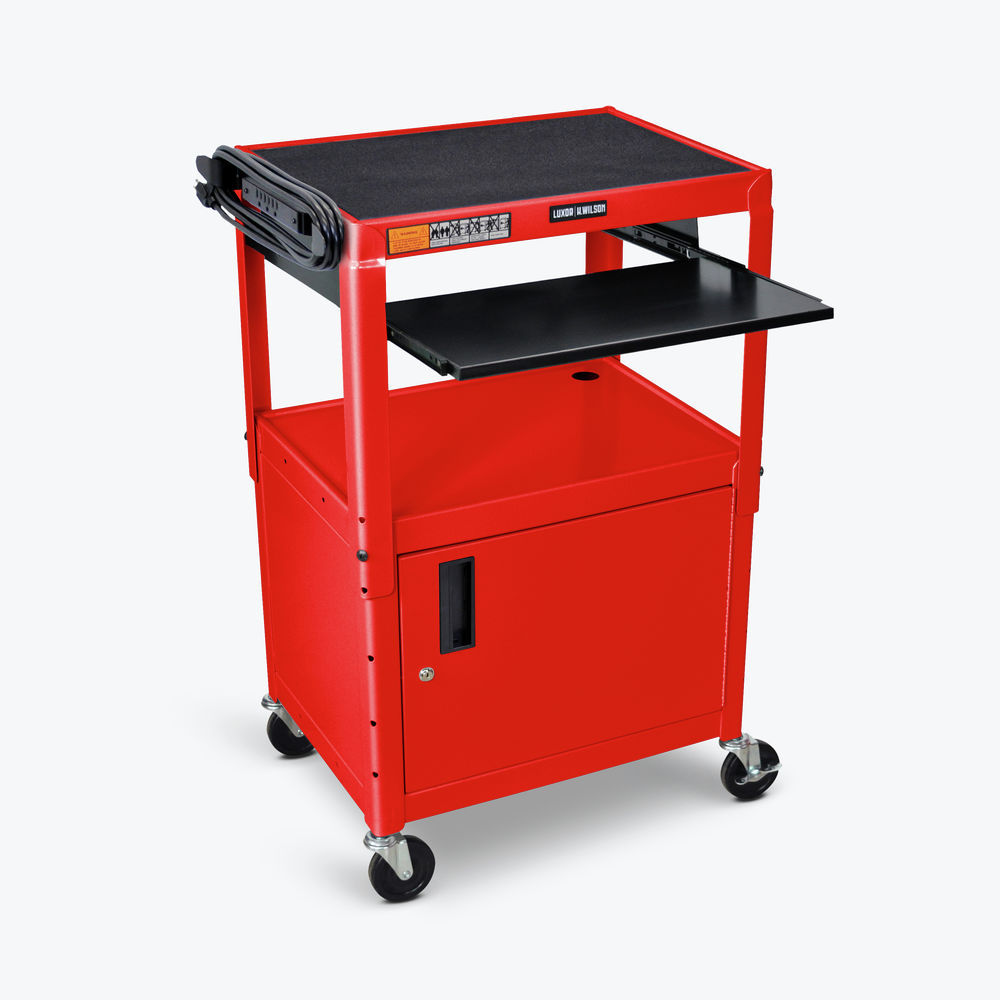 LUXOR | H. WILSON Duraweld Audio-Visual Carts with Locking Cabinet are the standard in the industry for moving electronic or test equipment. 20-gauge roll formed steel shelves with powder coat paint finish have -1/4" retaining lip. Top shelf adjusts in 2" increments from 24 to 42" along 14-gauge steel legs and includes a non-marking ribbed safety mat to protect delicate equipment and cable pass-through holes. 3-outlet UL and CSA listed electric assembly with 15' cord. Locking cabinet has recessed chrome handle and comes with 2 keys. Four swivel rubber casters, two with brakes. UL/CSA listed.