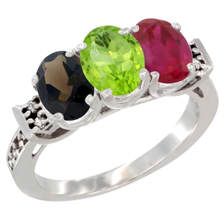 14K White Gold Natural Smoky Topaz, Peridot & Enhanced Ruby Ring 3-Stone Oval 7x5 mm Diamond Accent, sizes 5 - 10