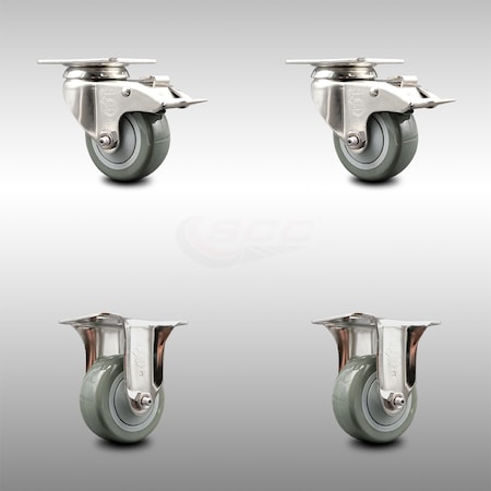 3.5 Inch 316SS Gray Polyurethane Swivel Plate Caster Lock Brake 2 Rigid, 2PK