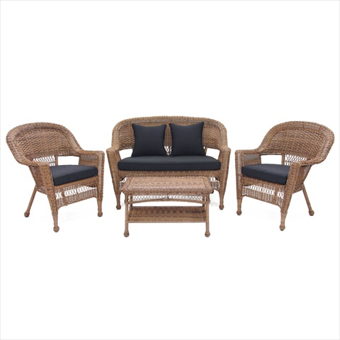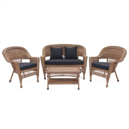 4 Piece Honey Wicker Conversation Set - Black Cushions