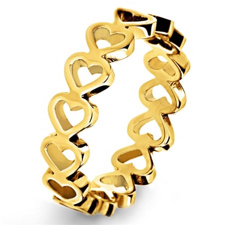 <p>Explore the widest collection of stylish, trendy, traditional fashion Jewellery for men and women in excellent quality to suit any occasion. We offer affordable range of necklaces, bangles, earrings, pendants, chains, rings and other jewellery items to choose from. </p> <p>Timelessly chic, this feminine open heart eternity ring is crafted from durable gold plated stainless steel. The perfect jewelry piece for any woman. </p> <b>Features</b> <ul> <li>Stunning designs to choose from</li> <li>Styles for every occasion</li> <li>Affordable prices and value for money</li> <li>Superior quality and style</li> </ul> <b>Specifications</b> <ul> <li><b>Size:</b> Size 5</li> <li><b>Band Width:</b> 5 mm</li> <li><b>Gender:</b> Womens</li> <li><b>Metal Type:</b> Stainless Steel</li> <li><b>Weight:</b> 0.004 lbs</li> </ul>- SKU: WST894