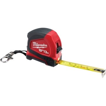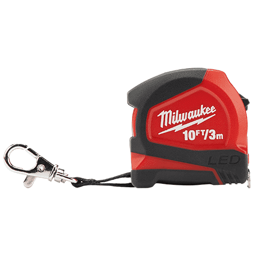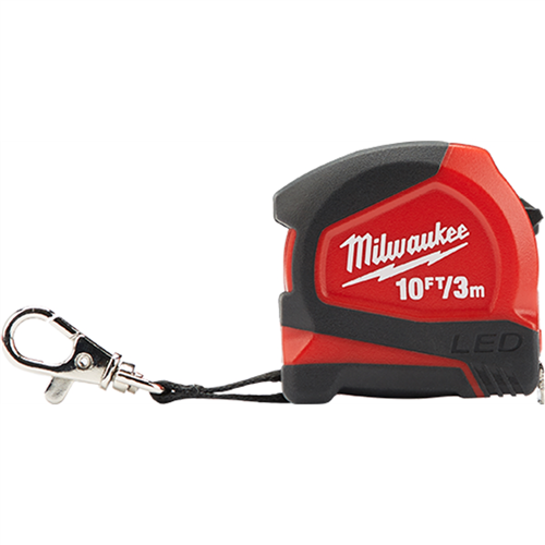 <ul><li>Versatile clip</li><li>4PT reinforced frame</li><li>4FT standout</li><li>Zero tolerance hook</li><li>10 lumen LED</li></ul><p>Milwaukee?s 10ft/3m Keychain Tape Measure with LED features an LED Light to help users more easily read measurements in low light conditions. 4-point reinforced frame for protection against damage from dropping. For added functionality the tape measure is equipped with a magnetic back for storage. A secure, heavy duty keychain clip gives it the versatility to clip onto almost anything ? from belts to key rings. Like all MILWAUKEE tape measures, it?s backed by a limited lifetime warranty.<br /><br /> </p><p></p><p></p><p></p><p></p>