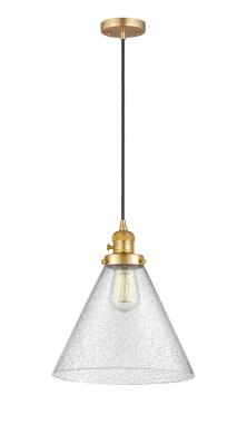 This 1 light Mini Pendant from the Franklin Restoration Cone collection by Innovations Lighting will enhance your home with a perfect mix of form and function. The features include a Satin Gold finish applied by experts. Product Features Include: Brand: Innovations Lighting, Collection: Franklin Restoration Cone, SKU: 201CSW-SG-G44-L-LED, UPC: 745684622680, Category: Mini Pendant, Finish: Satin Gold, Glass: Seedy X-Large Cone, Material: Steel/Cast Brass/Glass, Designer: Bruno Marashlian, Width: 12.00 in., Height: 14.00 in., Max Height: 135.25 in., Diameter: 12.00 in., Backplate/Canopy Width: 4.50 in., Backplate/Canopy Length: 0.00 in., Backplate/Canopy Thickness: 0.75 in., Weight: 8.45 lb., Included Chain/Rods/Cord: 10 Feet Of Black Textured Cord, Switch: On/Off Turn Switch, Warranty: 2 Year Finish, Lifetime Electrical, Bulbs Included: Yes, Bulb Category: LED, Primary Bulb(s): 1 x 3.50 watts Medium Base ST64 Vintage, Color Temperature: 2700K, Color Rendering Index: 82.0000, Total Lumens: 350, Voltage: 120, Safety Rating: UL/ETL Damp, Title 20 Approved