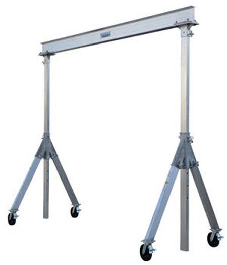 ALUMINUM GANTRY CRANES Ideal for use in multiple or remote locations. These units are unaffected by weather and/or wet conditions. Provides safe, one-person lifting of heavy equipment in a variety of work-sites. It's lightweight design enables for quick assembly and knockdown. The welded aluminum cranes have adjustable I-beams for an infinite number of span settings, plus 2 adjustable height uprights. Polyurethane-on steel include 4 position swivel locks for secure placement. Remember to order a hoist and trolley Order Now!!