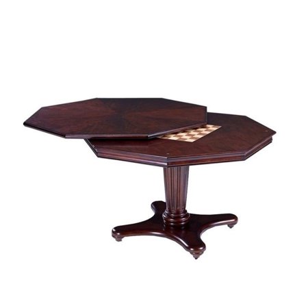 This piece takes your game room to a whole new level with our game table. Our multi-functional offers a flip top table that allows for a dining surface on one side and a game surface complete with chip trays and drink holders on the other. Feel like checkers or chess? Take off the entire top, and you'll find a built in board. This piece is the perfect way to turn your kitchen or dining room into an entertainment hot spot for friends, family and fun. Cherry finish ; Flip top table ; Built in board ; Solid birch base with a birch veneer top over fiberboard . Specifications: Overall dimensions: 32'' H x 52" Diameter ; Product Weight: 172 lbs.