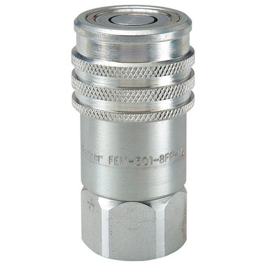 Parker FEM Series non-spill couplings. 1" female flush face coupler, 3000 PSI. Push-to-connect locking mechanism.