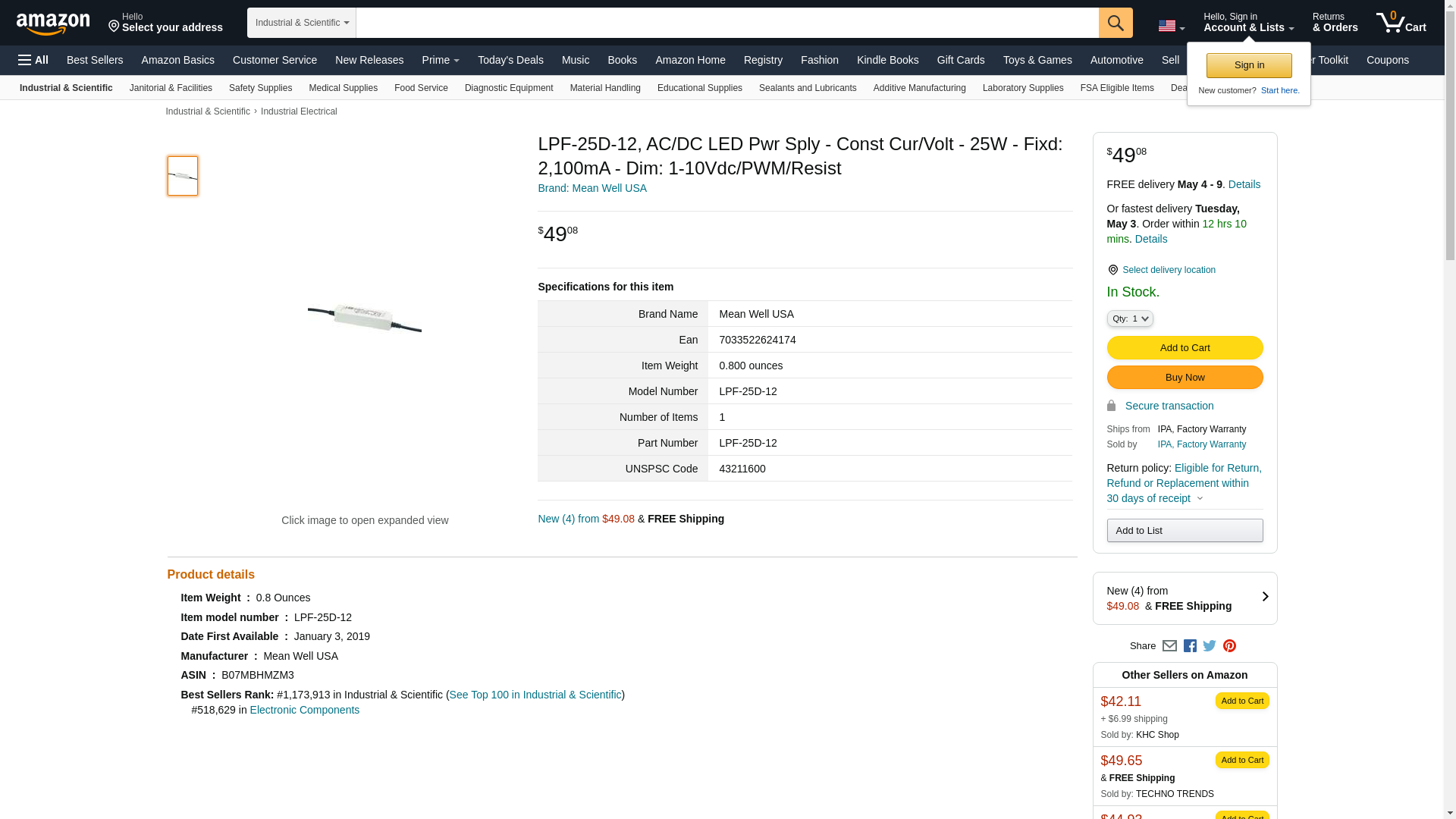 ![]() powersupplymall.com | LPF-25D-12 | 1 | 5 | 1 | 1 @ $29.57 |