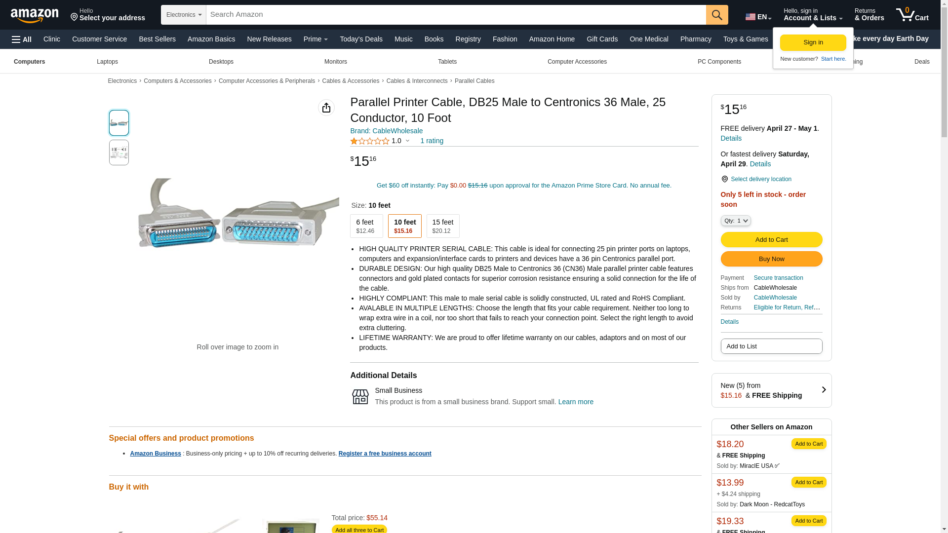 | Feature | DB25 Male / Centronics 36 (CN36) Male, 25C, Mold, 10 ft |