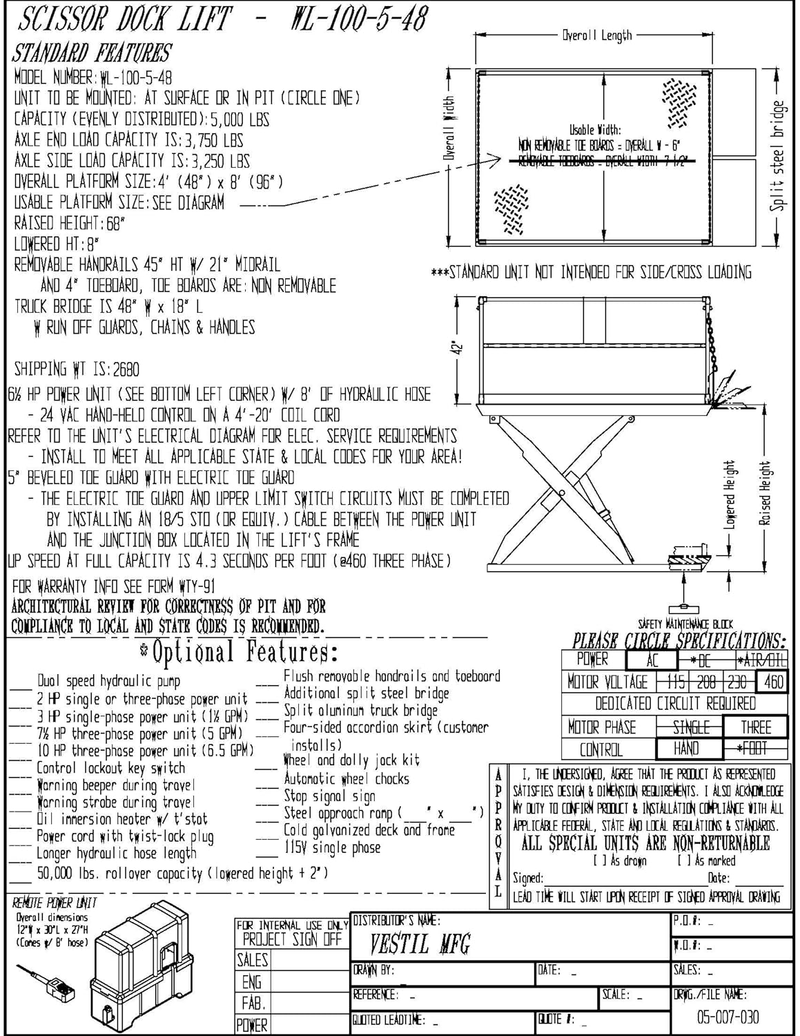 Includes pre-wired control box with Magnetic Starter and overload fuse Comes standard with a 6.5HP 460V 3 PH 60 HZ motor - that can be located as much as 8 feet away from the unit Other Power options available Has excellent safety features - like the electric toe guard. DO NOT remove safety devices! For outdoor use - consider the outdoor dock lift with galvanized base and legs See below for the site survey fork and the installation an owners manual Order Now Platform W x L: 48 x 96 Wt. (lbs.): 2,362# Lowered Hgt.: 8 In Lift Raised Hgt.: 68 In Frame Size W X L: 41 x 93 In