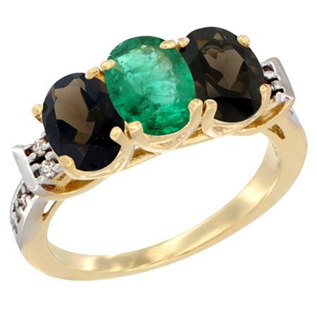 14K Yellow Gold Natural Emerald & Smoky Topaz Sides Ring 3-Stone Oval 7x5 mm Diamond Accent, sizes 5 - 10