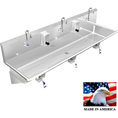 BSM Inc. Stainless Steel Sink, 3 User w/Knee Valve Operated Faucets, Wall Brackets 72"L X 20"W X 8"D