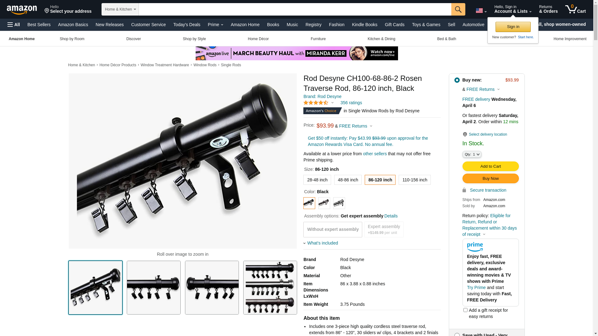 Rod Desyne CH100-68-86-2 Rosen Traverse Rod, 86-120 inch, Black
