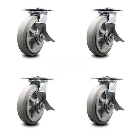 Heavy Duty Large Top Plate Thermo Rubber Flat Tread Swivel Caster w/Main. Free Bearings Set of 4 w/8" x 2" Gray Wheels - Includes 4 Swivel w/Side Lck Brakes - 2400lbs Total Cpty - Service Caster Brand