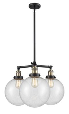 INNOVATIONS LIGHTING 207-BAB-G204-10 X-Large Beacon 3 Light Chandelier part of the Franklin Restoration Collection. The X-Large Beacon 3 Light Chandelier is part of the Franklin Restoration Collection. Includes 1-6 and 2-12 inch Stems. Additional Stems sold separately. Solid Brass 90 Degree Hang Straight Swivel for Sloped Ceilings Included. Collection: Franklin Restoration. Material: Steel, Cast Brass, Glass. Metal Finish(Body): Black Antique Brass. Metal Finish(Canopy/Backplate): Black Antique Brass. Dimension(in): 24(W) x 13.75(H). Minimum Height (Fixture Height with Shade, Cord or Included Stems & Canopy)(in): 24.875. Max Height (Fixture Height with Cord or Included Stems & Canopy)(in): 48.875. Bulb: (3)100 Medium Base Vintage Bulb recommended(Not Included). Voltage: 120. Glass: Seedy Beacon/Seeded. Shade Shape: Globe. Shade Material: Glass. Shade Size(in): 10 X 9. Shade Fitter Measurement: 3.25 inch Fitter. Canopy Dimension(in): 4.5 x 0.75. Includes 10 Feet of Wire. Solid Brass 90 Degree Hang Straight Swivel for Sloped Ceilings Included. UL/CUL Damp Rated. Warranty: 2 Year Finish, Lifetime Electrical.
