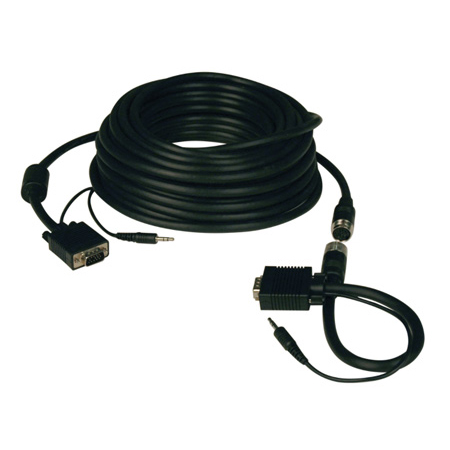 Tripp Lite's 100 ft. SVGA/VGA Easy Pull Monitor Cable with Connectors and built-in 3.5mm Audio makes running long length video cables a snap. The pull-apart design allows the cable to be run through conduit or other tight areas that a HD15 connector wouldn't fit through. Diameter of the circular DIN end is only 7/8". Circular Easy Pull connector is threaded to ensure maximum security once the cable is re-attached. The mini-coax (RGB) and paired video wire construction delivers superior signal quality. Double shielding (foil and braid) provides maximum EMI/RFI protection. Both high density DB15 males and 3.5mm stereo connectors are molded and have integral strain relief to ensure they last a long time.</p>