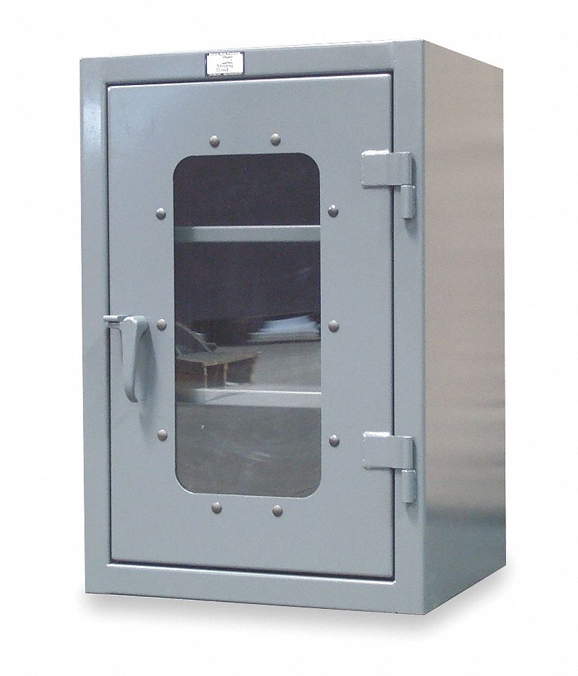 Storage Cabinet, Base Type Legs, Body Panel Type Solid, Cabinet Color Dark Gray, Cabinet Material Steel, Cabinet Storage Components Shelves, Door Handle Type Swing, Door Type Solid, Duty Rating Super Duty, Frame Assembled Assembled, Load Capacity per Shelf 1,900 lb, Lock Type Padlock Hasp, Mobility Stationary, Number of Shelves 2, Overall Depth 20 in, Overall Height 36 in, Overall Width 24 in, Audit Trail Storage None, Cabinet Finish Baked Enamel, Number of Doors 2