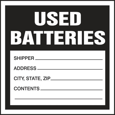Hazardous Waste Label, Material Polyester, Legend Shipper_______Address_______City,State,Zip_______Contents_______, Height 6 In., Width 6 In., Legend Color Black, Background Color White, Header Used Batteries, Language English, Legend Style Text, Write on Surface Yes, Self-Adhesive Yes, Shape Square, Package Quantity 250