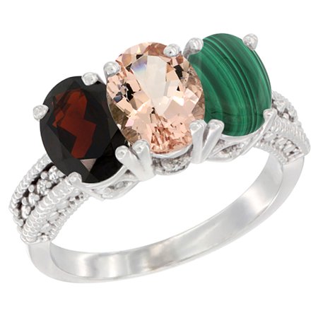 10K White Gold Natural Garnet, Morganite & Malachite Ring 3-Stone Oval 7x5 mm Diamond Accent, sizes 5 - 10