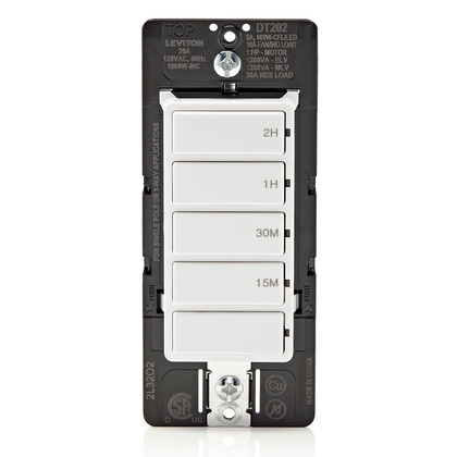 Leviton DT202-1LW Countdown Switch for lights, attic, heaters, pool pumps, 15-30 min, 1-2 hour, Neutral Wire Required, 20A, 1 HP/16A Fan/Motor, Single Pole, Way or Multi-Timer, White, 20-Amp